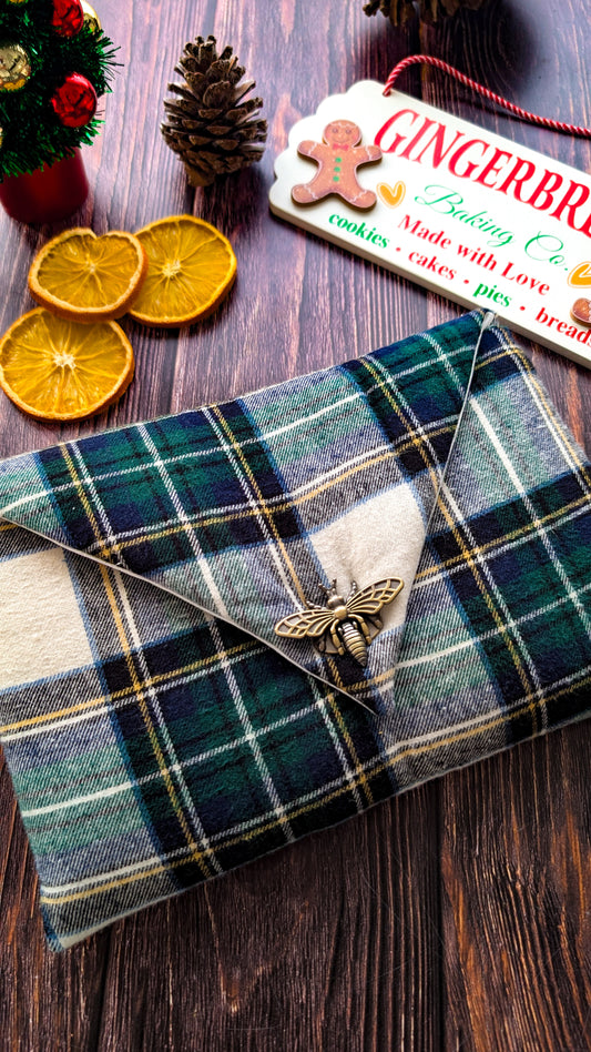 Pochette pour livre en flanelle de coton tissu tartan bleu et vert avec fermoir abeille en laiton