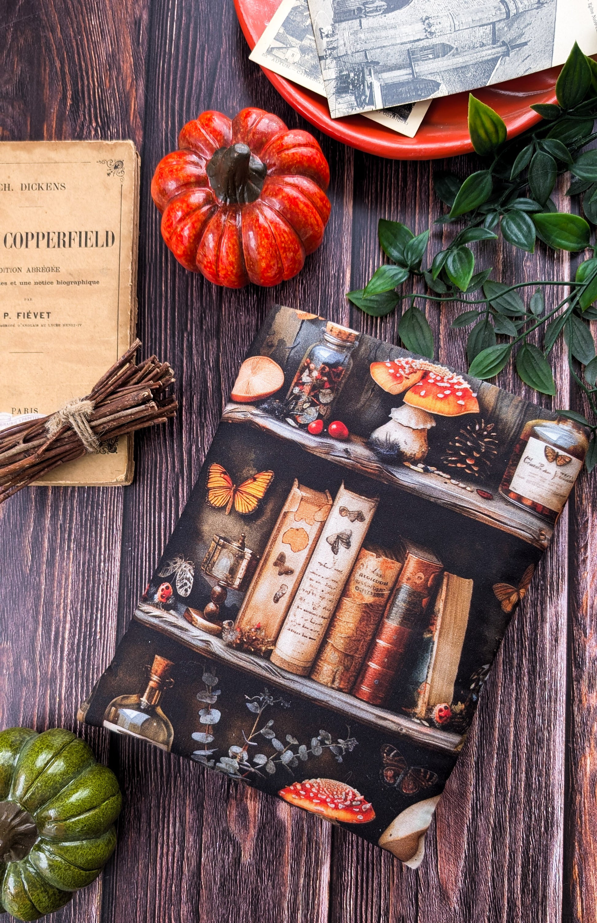 Pochette à livre et liseuse imprimé bibliothèque champignons