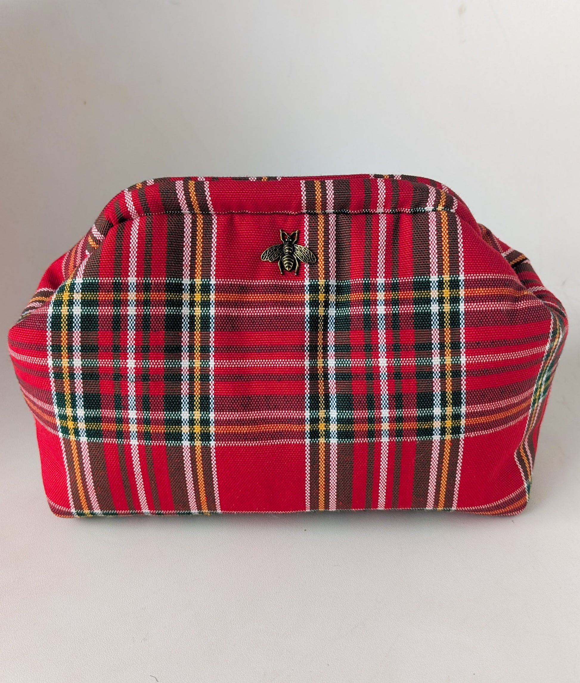 Cette trousse de toilette à fermoir clic-clac est confectionnée à la main dans un tissu tartan en coton de qualité.